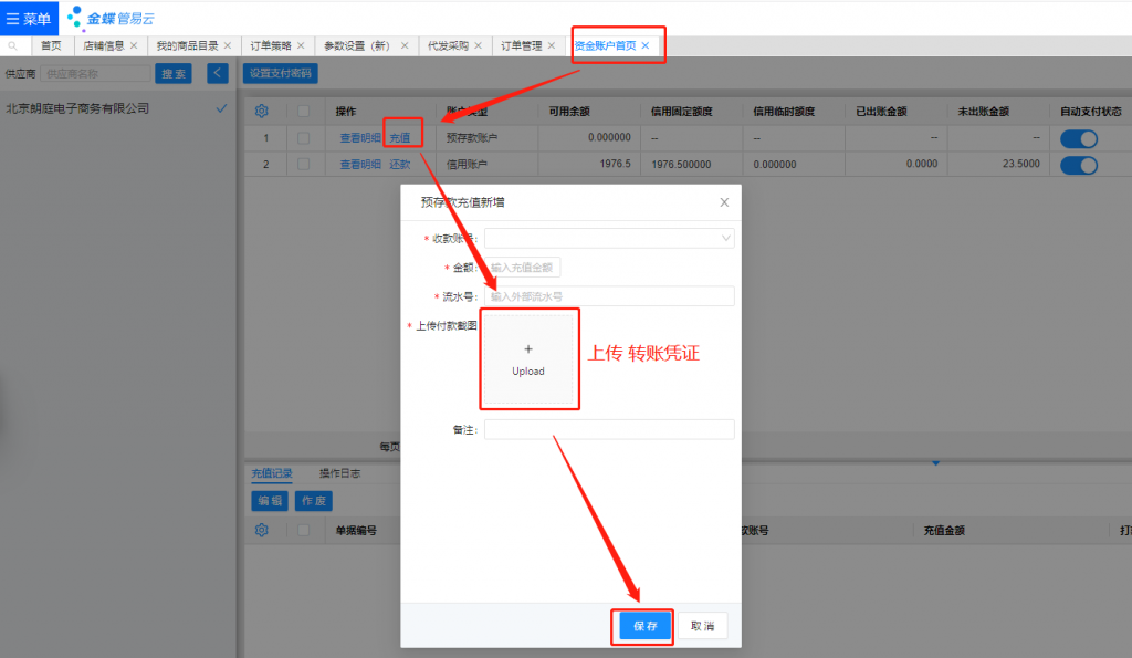 第二步、上传 转账凭证 到系统,联系群财务  审核充值