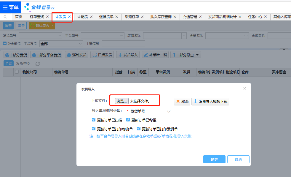 解决办法:未发货界面使用发货单导入,导入快递单号,然后未发货点发货。