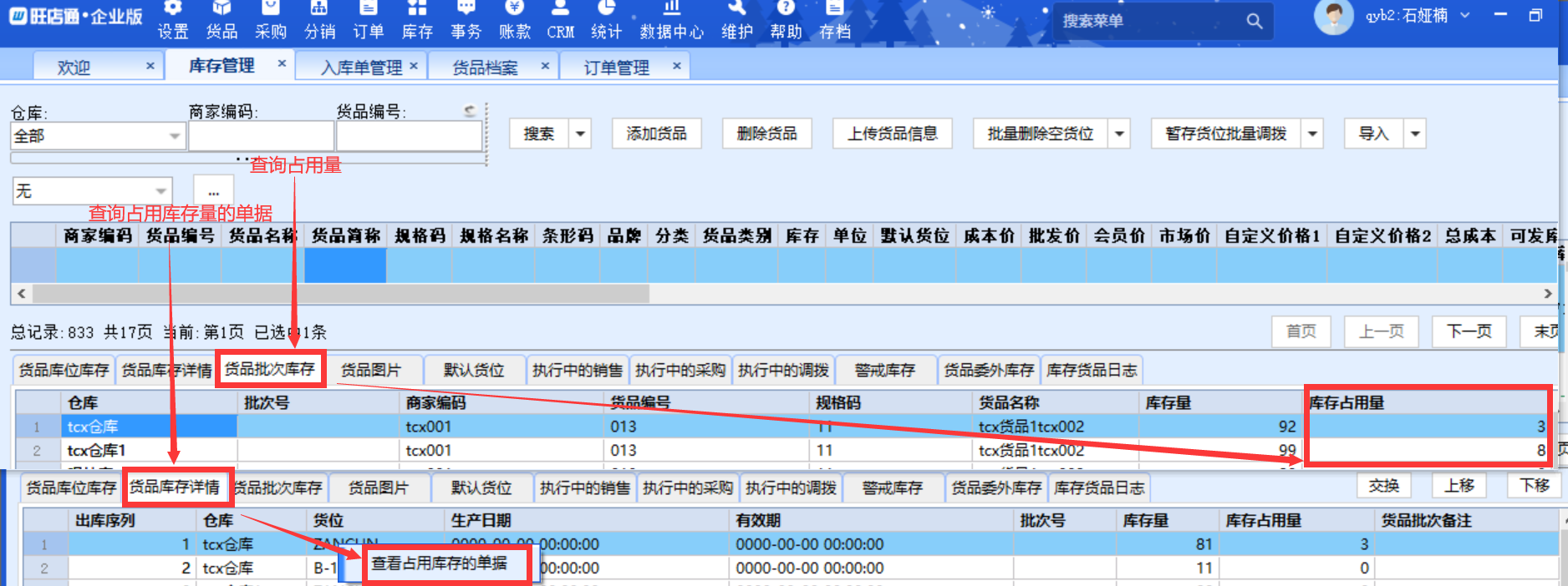 在库存-库存管理-【货品批次库存】可查询库存占用量,在【货品库存详情】-右键可查询被占用的单据,订单审核后才会扣除占用量,若需释放占用的库存,可右键【释放占用库存】
