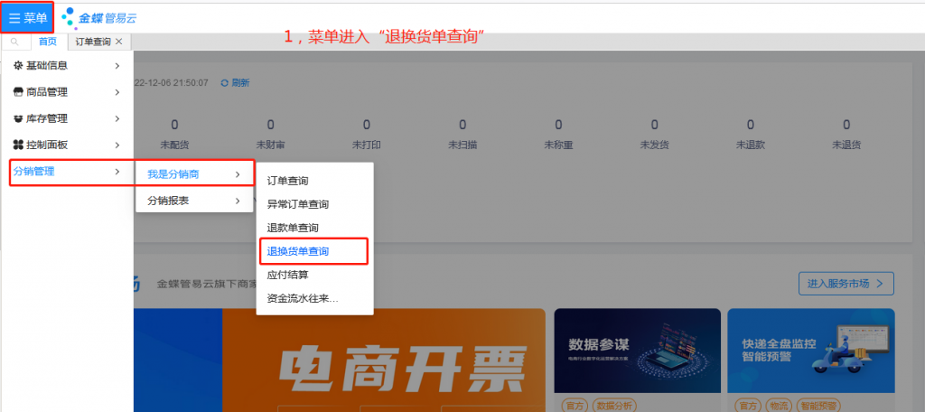 退换货单 “全部入库”  即为货品退回,可以进行结算。(全部入库 生成 退款单,退款至分销商账户中,在“分销商-资金流水往来账单” 查看到返款 记录)